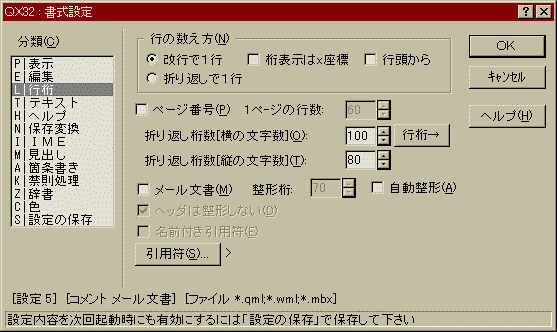 (1) QXエディタの書式設定ダイアログから「行桁」を選択して、